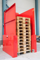 Palety można odbierać pojedynczo lub cały stos. Urządzenia produkowane są w wersjach z napędem pneumatycznym lub elektrycznym.