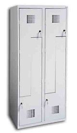 Szafa ubraniowa z drzwiami w kształcie litery L. Niezastąpiona wszędzie tam gdzie na małej powierzchni, trzeba zapewnić możliwość przebrania się, dużej liczbie osób. Dotyczy to np. basenów czy szkół. Otwarcie pojedynczych drzwi szafki umożliwia dostęp do dwóch przegród ( mała o wymiarach: 400×200×490; duża 1300×200×490 mm ). Szafka zamykana jest na zamek cylindryczny o jednopunktowym mechanizmie ryglującym. Szafa wyposażona w drążek ubraniowy z 2 haczykami, samoprzylepny wizytownik. Malowana lakierem proszkowym. Wszystkie elementy szafy wykonane z blachy 0,5 mm.