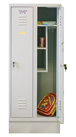 Szafka ubraniowa o wysokości 1500 mm przeznaczone są dla młodszych uczniów. Wysokość szafki umożliwia wygodne korzystanie z półek i wieszaków. Szafa wyposażona jest w drążek z haczykami, półki na książki i podręczne drobiazgi, haczyki i lusterko na drzwi. Szafa zamykana jest zamkiem cylindrycznym.