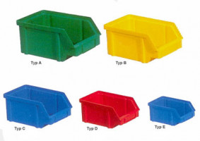 Przeznaczone do ustawiania w stos nie blokując dostępu do przechowywanych towarów. Wykonane z polipropylenu. Odporne na uderzenia, większość chemikaliów oraz temperaturę w zakresie od -5 do +60 st.C. Dostępne w kolorach: czerwony (RAL-3020), niebieski (RAL-5017), zielony (RAL-6024) i żółty (RAL-1016). Na stanie magazynowym posiadamy pojemniki w kolorach czerwonym i niebieskim.