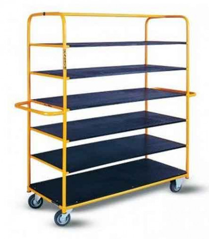 Wózki sześcio-półkowe przeznaczone są do transportu i konfekcjonowania towarów. Mogą być także używane jako mobilne regały. Konstrukcja metalowa wykonana jest z rur stalowych malowanych lakierem proszkowym. Półki wykonane są z gładkiej lub antypoślizgowej sklejki. Udźwig każdej półki 100 kg. Standardowo montowane są dwa koła skrętne i dwa stałe.