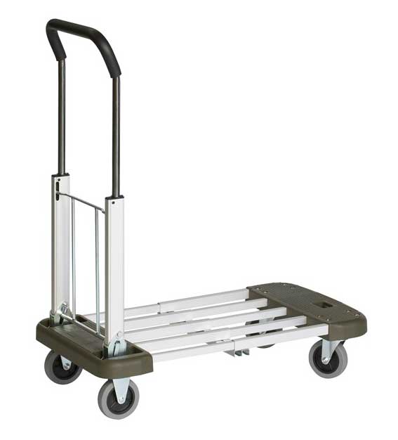 Wózek platformowy, który można złożyć do bardzo małych rozmiarów. Zarówno platforma jak i uchwyty są składane. Aluminiowa konstrukcja sprawia, że wózek jest bardzo lekki a zarazem wytrzymały. Bieżniki kół z wykonane są z szarej niebrudzącej gumy.